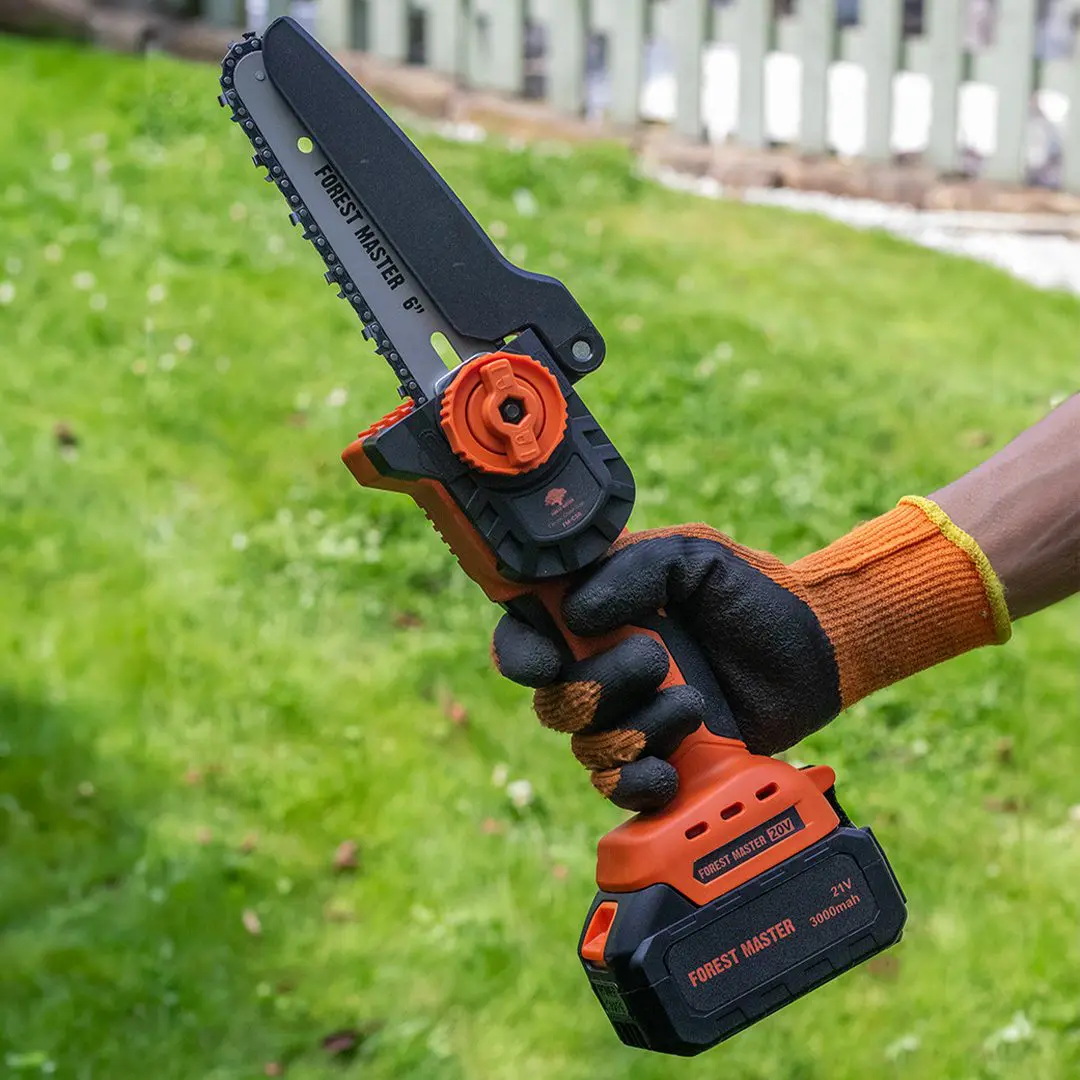 Designed for ease of use, the Forest Master mini chainsaw is both lightweight and ergonomic. Its compact build reduces user fatigue, making it comfortable to use for extended periods. Spend hours working in your garden or on-site without feeling the strain on your arms and shoulders. The ergonomic design enhances portability, making it easy to maneuver, especially in tight or awkward spaces.
